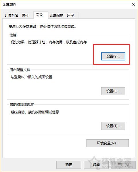 3、在系統(tǒng)屬性窗口中,我們?cè)佟靖呒?jí)】選項(xiàng)卡中,點(diǎn)擊性能下面的“設(shè)置”按鈕,如下圖所示。