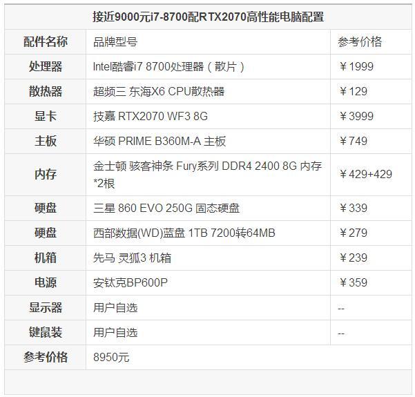 9000元i7-8700搭配RTX2070電腦配置推薦 高性能游戲電腦配置