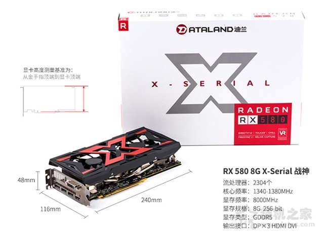 迪蘭RX 580 8G X-Serial戰神采用了14nm工藝的Polaris20結構。顯卡的顯存規格為8GB/256-Bit,核心頻率為1355-1380MHz,搭載了2304個流處理器,顯存頻率可達8000MHz,可滿足大部分游戲需求。