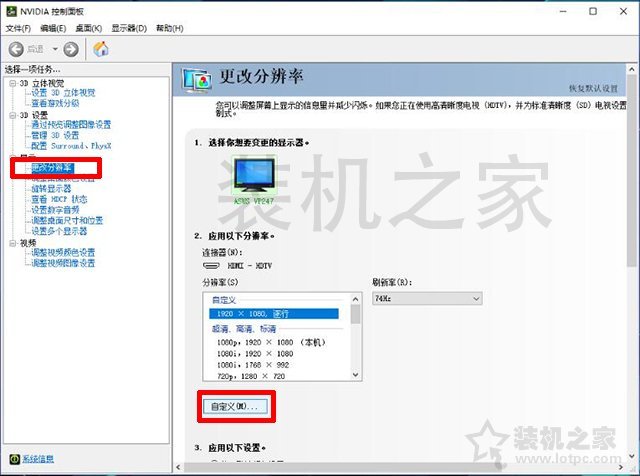 1、這里我們以NVIDIA顯卡(N卡)為例,鼠標右鍵桌面空白處選擇“NVIDIA控制面板”,在NVIDIA控制面板界面中,我們點擊“更改分辨率”,在右側窗口中點擊“自定義”按鈕,如下圖所示。