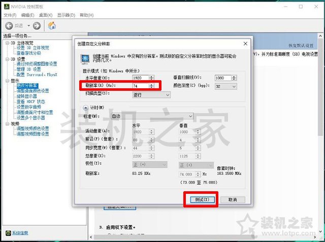3、找到刷新率,輸入刷新率,建議設置從70Hz起,以5hz為單位向上調,不建議一下就調整為144Hz,幾率很小,需要一步一步微調,直到找到合適的幀率。比如我們調到75Hz出現了黑屏或者花屏的情況下,說明并不合適,我們需要往下調整,如果我們調整到74Hz,一切正常,那么最佳無疑是74Hz,這就意味著我們顯示器屏幕刷新率最高可超頻至74Hz。