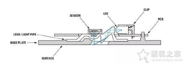 以光電式為例,它通過發光二極管打到接觸面上,再反射回CMOS傳感器,通過內部的DSP運算比較圖像,計算出位移。