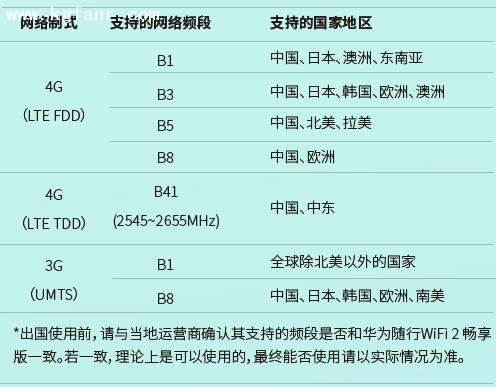 A3:若使用國內運營商資費卡:1)聯系國內運營商確認是否可以在該地區上網;2)參考如下表格確認當地網絡是否支持華為隨行WiFi的頻段和制式。