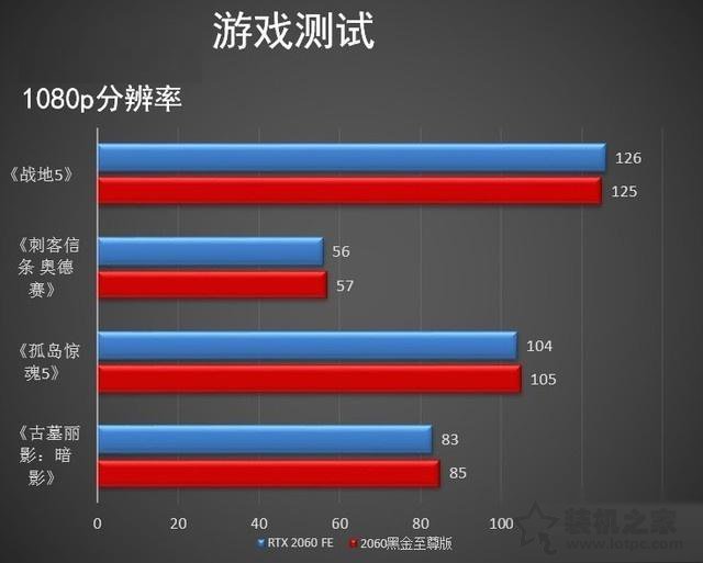 我們來看看RTX2060顯卡性能表現,分別采用了《戰地5》、《孤島驚魂5》、《古墓麗影 暗影》和《刺客信條 奧德賽》,其中《孤島驚魂5》與《刺客信條 奧德賽》支持DX11,其他兩款支持DX12,分辨率設為1080P,映眾 GeForce RTX 2060黑金至尊版 6G與公版RTX 2060進行對比。