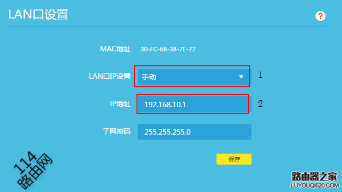 把這里的【自動】修改為手動,并輸入想要設置的網段,比如192.168.10.1,子網掩碼 255.255.255.0 直接輸入該地址和掩碼保存即完成了TP-link無線路由器內網地址修改的工作。