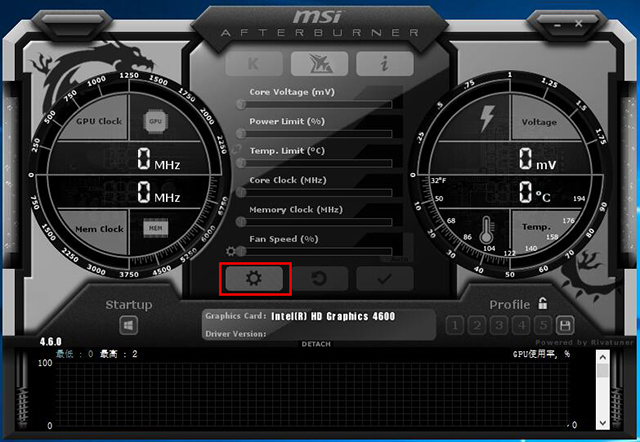 這時會彈出MSI Afterburner設定界面中,由于本人沒有獨立顯卡,GPU1就是核心顯卡。一般有獨立顯卡,GPU1是獨立顯卡,GPU2是核心顯卡。