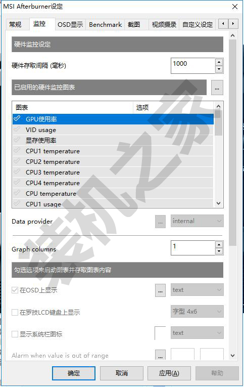 我們切換至“監控”的選項卡中,點擊勾選圖表中的需要顯示的硬件狀態,每一項并勾選在OSD上顯示,這樣游戲中就會顯示該項監控情況了。。
