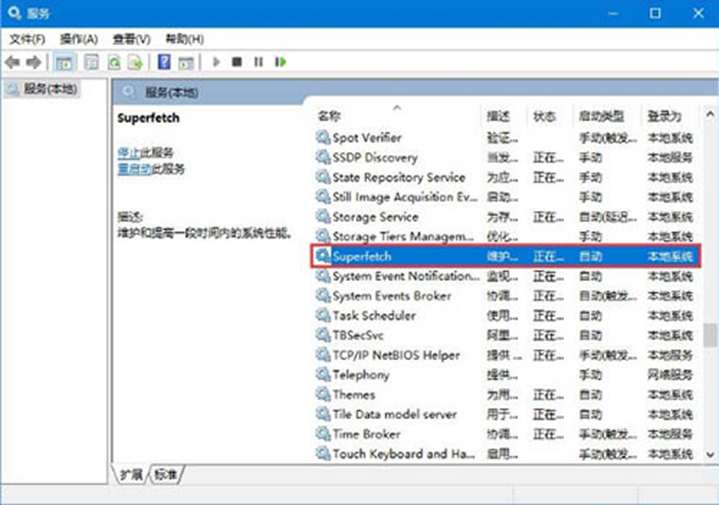 2、打開服務界面,在服務中找到superfetch服務。如圖所示: