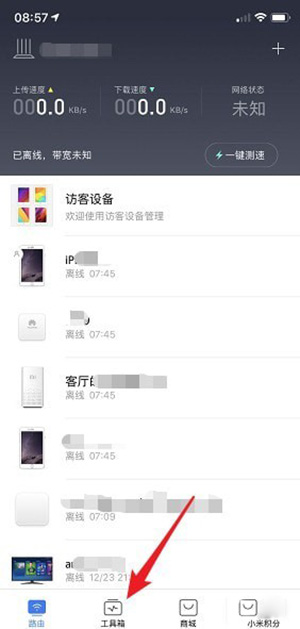 1、首先,先準備一個移動硬盤,然后打開小米wifi app,看到【工具箱】,進行點擊;