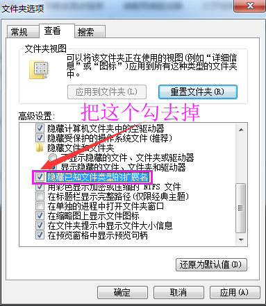 第四步:如上圖,把【隱藏已知文件類型的擴展名】前面的勾去掉即可。