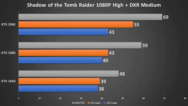綜合來說,GTX 10/16 系列確實能享受光追帶來的畫面,但即便是兩個系列中相對高端的 GTX 1080、GTX 1660,即便是在 1080p 分辨率和中高畫質下,也基本都撲街了,平均幀率大多難以保障游戲的流暢性,只有《古墓麗影:暗影》略好一些,GTX 1080 仍能完全流暢。