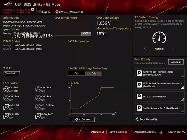 當(dāng)電腦主機(jī)開機(jī)的一瞬間,我們在鍵盤上按“DEL”鍵或者“Delete”鍵,反復(fù)按幾次,直到進(jìn)入BIOS設(shè)置界面中,目前在BIOS識別的內(nèi)存頻率為2133MHz,我們按下F7鍵進(jìn)入到高級模式設(shè)置。