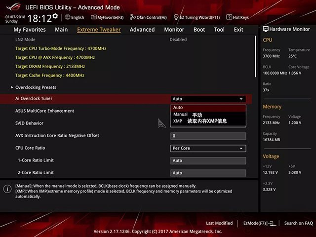 這時已經(jīng)進(jìn)入了BIOS高級模式,在“Extreme Tweaker”選項(xiàng)卡中,進(jìn)入超頻選項(xiàng),選擇“ai overclock tuner”,出現(xiàn)三個選項(xiàng),第一個為AUTO,第二個為手動,第三個則是我們即將選擇的XMP。