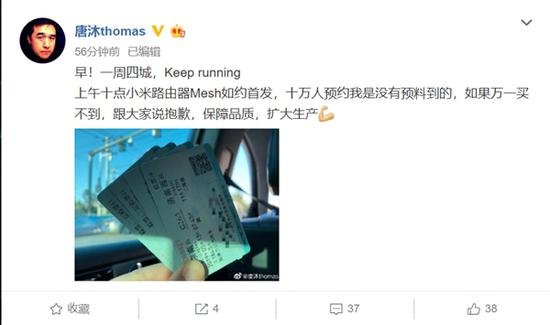 截至5月13日上午7:20,小米路由器Mesh預(yù)約量已經(jīng)高達(dá)10萬人。唐沐表示,10萬人預(yù)約是我沒有預(yù)料到的,如果萬一買不到,跟大家說抱歉,保障品質(zhì)、擴(kuò)大生產(chǎn)。