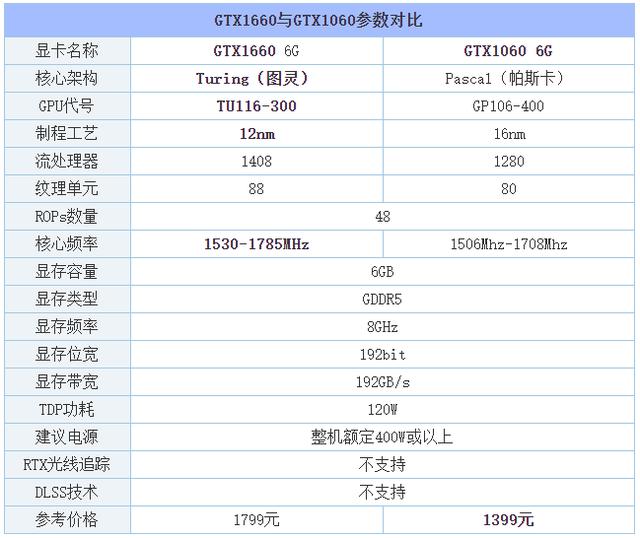 從兩者參數(shù)對比已經(jīng)看出,GTX1660是GTX1060的升級版,在流處理器、紋理單元、核心頻率都有小幅升級,不過GTX1660采用了全新的圖靈架構(gòu)(Turing),擁有更先進12NM工藝制程,在功耗控制上無疑會更好。雖然在參數(shù)上只有小幅升級,但是架構(gòu)對顯卡的影響較大,往往新架構(gòu)可以讓顯卡擁有更高效的性能體驗,更好的優(yōu)化等特點。