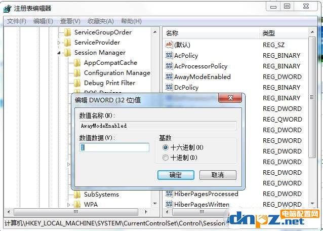 3、把AwayModeEnabled 數值設置為1確定,如果沒有該項目,新建一個Dword 32位值,命名為AwayModeEnabled再修改數值即可