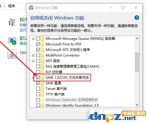 4、找到“SMB1.0/CIFS文件共享支持”勾選起來再確定;