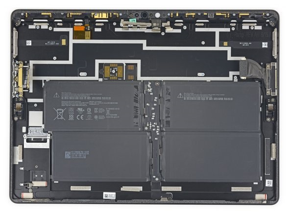 電池牢固地粘在適當的位置,其連接器固定在主板下方,需要完全拆卸才能維修。