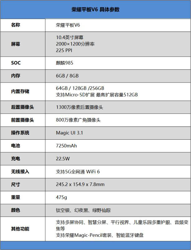 榮耀平板V6的配置相當強悍。一塊2K分辨率的10.4寸屏幕、四揚聲器、以及支持Huawei-Pencil和藍牙鍵盤外設連接,無論是看電影還是辦公都能提供最佳的體驗;此外,集成式5G旗艦芯片麒麟985的加持,也讓榮耀平板V6擁有了相當不俗的性能,可以從容應對各類游戲的挑戰。