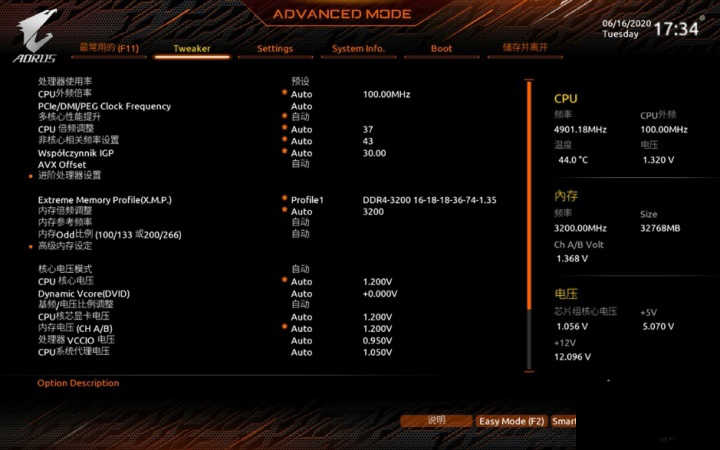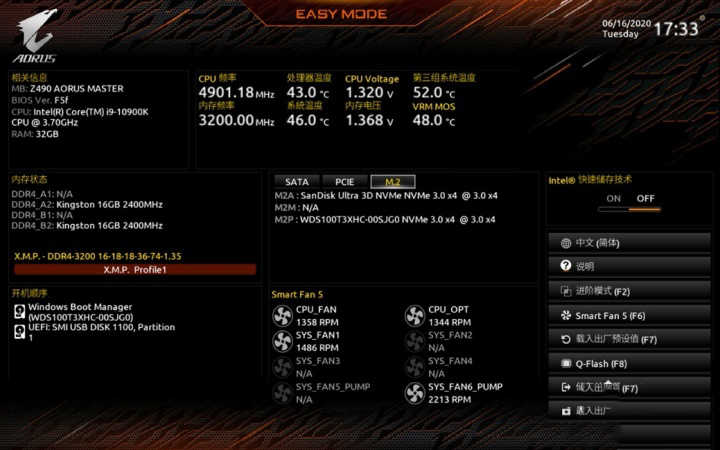 說到BISO,技嘉作為較早推行圖形化BIOS的廠商之一,旗下主板產品,尤其是中高端系列中,已經全面采用了新的圖形界面。在Z490 AORUS MASTER中使用了新一代的簡易模式,在單一頁面顯示了包括CPU頻率、內存信息、存儲設備等在內的重要硬件信息,非常的直觀。