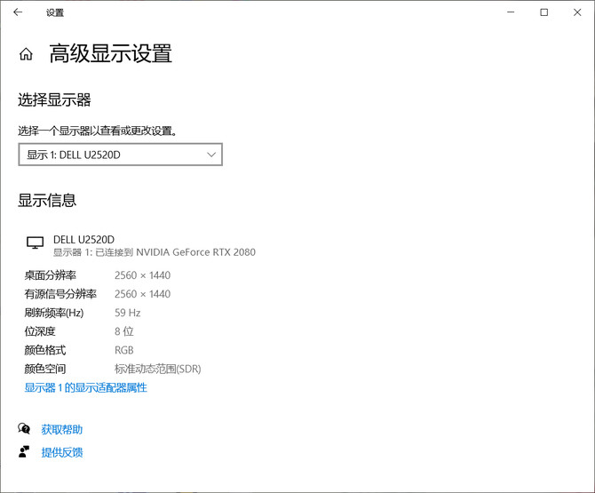 測試的主機搭載英特爾i9-9900k處理器,配備RTX2080獨立顯卡,以及32GB DDR4內(nèi)存。數(shù)據(jù)線采用了隨顯示器附帶的DP連接,在顯示設(shè)置里可以看到桌面分辨率為2560×1440,屏幕刷新率為59Hz,RGB色彩格式。