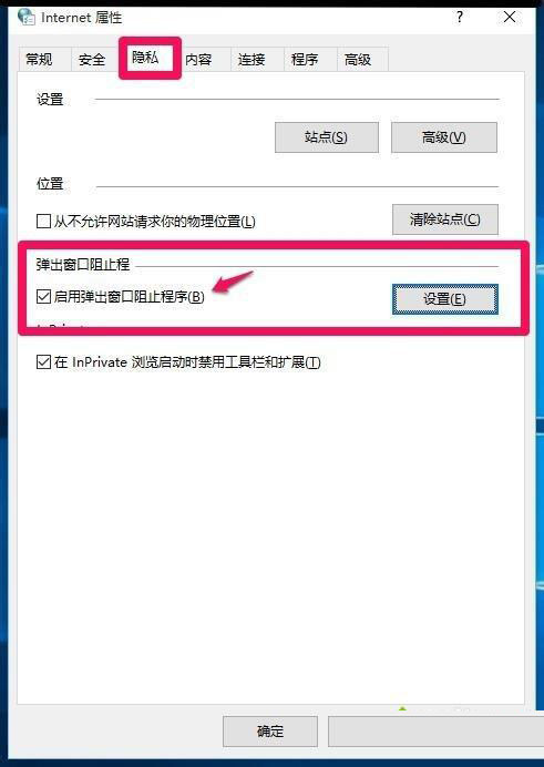 2、在打開的Internet 屬性窗口,點擊:隱私,在隱私標簽下,點擊:啟用彈出窗口阻止程序(B),打上勾。