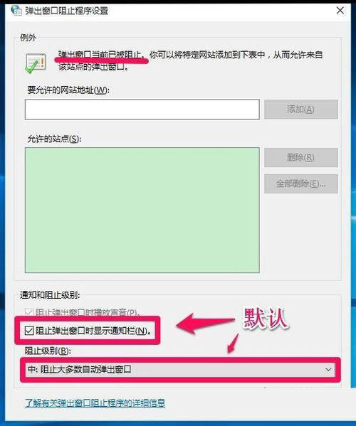 3、再點擊:設置,打開彈出窗口阻止程序設置窗口,我們可以看到:彈出窗口當前已被阻止(我們可以設置將特定網站添加到下表中,允許來自該站點的彈出窗口),默認通知和阻止級別中的阻止彈出窗口時顯示通知欄(N)和阻止級別(B)中:阻止大多數自動彈出窗口;再點擊:關閉。