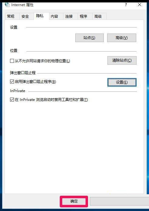 4、回到nternet 屬性隱私標簽窗口,點擊:應用 - 確定。