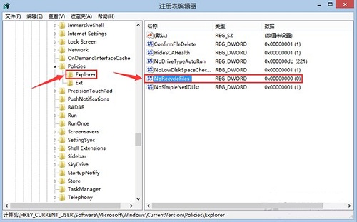 2、在注冊表編輯器界面中,我們依次展開“HKEY_CURRENT_USER\Software\Microsoft\Windows\CurrentVersion\Policies\Explorer”,單擊選中“Explorer”,在窗口右邊找到“NoRecycleFiles”,如下圖所示: