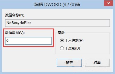 3、雙擊打開“NoRecycleFiles”,如果想要刪除文件后進入回收站,那么數值數據設置為0,如果想要徹底刪除文件而不進入回收站,那么直接將數值數據設置為1,最后重新啟動電腦即可。