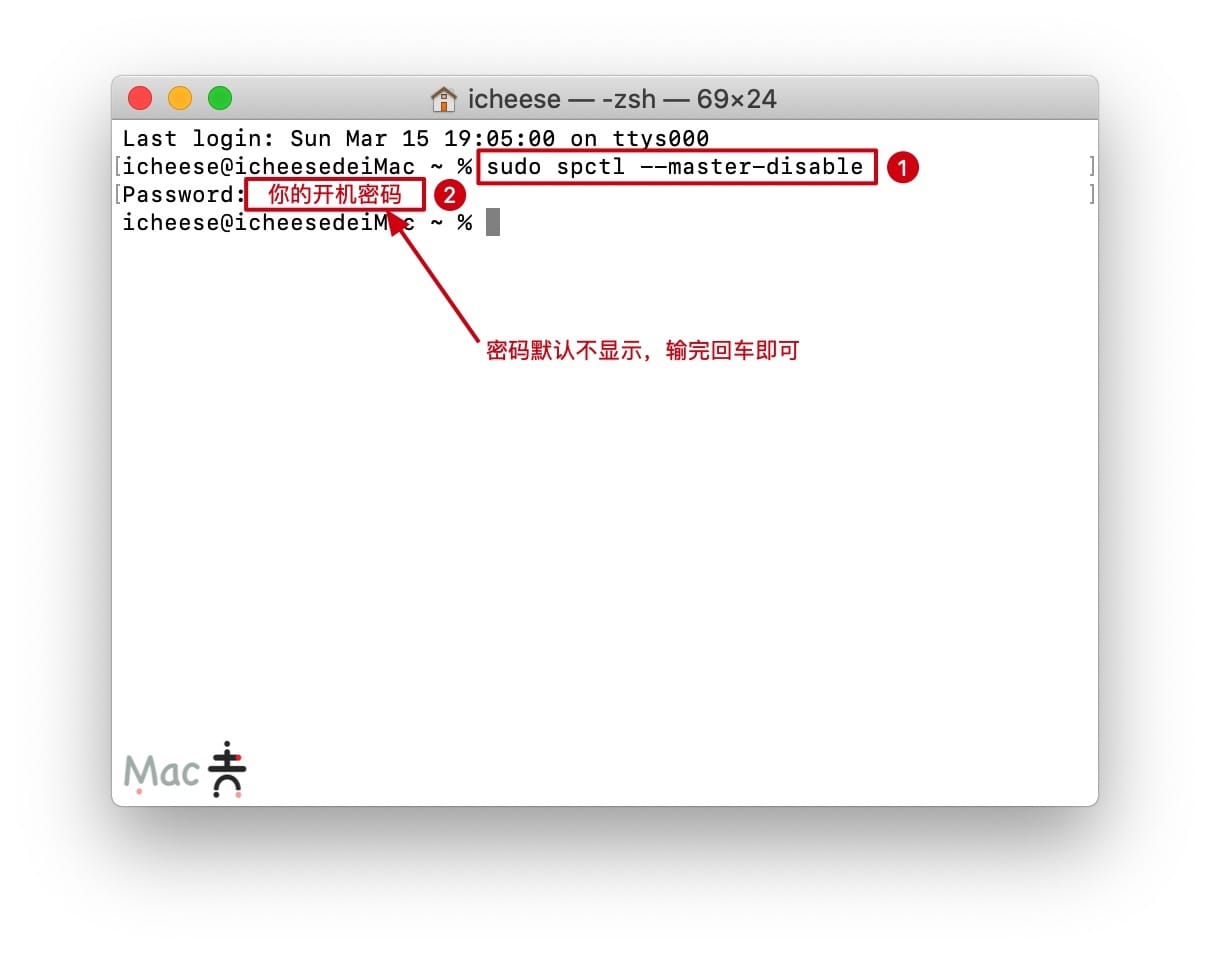 打開終端App,輸入下列命令,輸入啟動密碼回車。