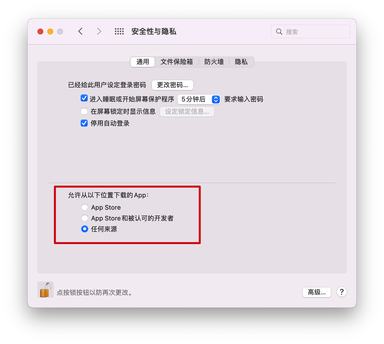 完成上述步驟后,打開“系統首選項”-“安全與隱私”-“常規”,以確保更改為“所有源”。