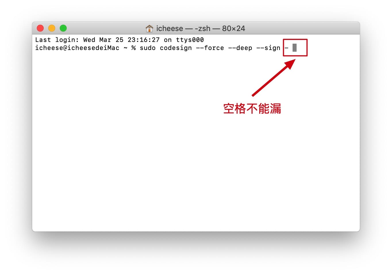 然后再次執行如下指令即可:codesign --force --deep --sign - /文件位置(直接將應用拖進去即可)