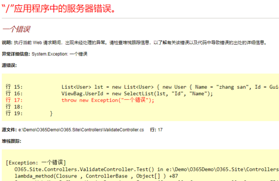 在TestAction中直接拋出一個異常,那么我們可以看到與下面類似的黃頁