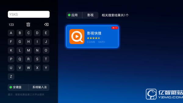 1、小米盒子進入應用,找到并打開當貝市場,點擊右上角的搜索框,輸入影視快搜首寫字母“YSKS”,根據提示依次執行下載、安裝、打開等操作。