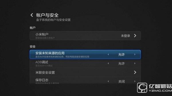 2、打開“小米盒子設置”→“賬號安全”,將“安裝未知來源的應用”設置為允許。注意,“ADB調試”要保持關閉狀態,如果已經開啟了請關閉并重啟,否則無法正確安裝。