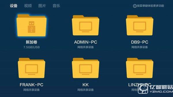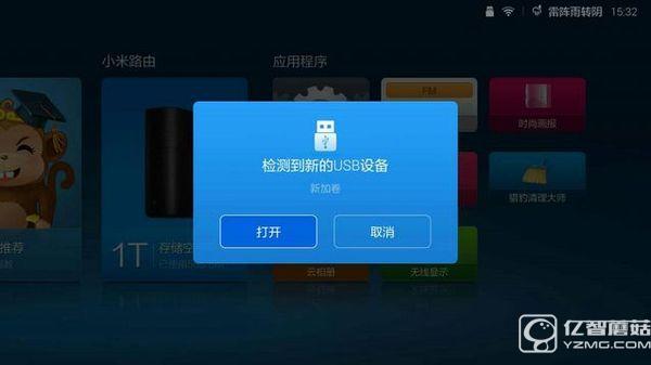 3、將U盤插到小米盒子的USB接口上面,檢測到新的USB設備并打開。如果沒有彈出對話框,選擇應用程序下的“高清播放器”,切換到“設備”標簽,選擇“移動存儲設備”。