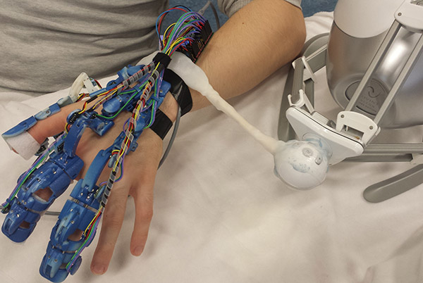 外科醫生把手伸進外骨骼,上面帶有磁性傳感器,可跟蹤手的位置。然后,外骨骼把手的動作傳達給機器人的手,向安裝了工具的每根機器人手指描繪醫生手指的動作。如果醫生移動他們的拇指、食指或中指,那么機器人的拇指、食指或中指也會重復這些動作。