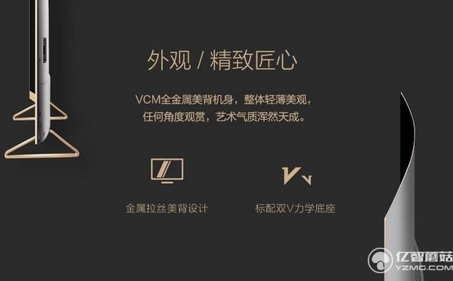 與常見電視的四個邊角都是方形不同,V1的邊角采用金屬曲面異形一體折彎成型設計,結合右下角的圓環,整機看上去比較圓潤一些。同時,作為一款曲面電視,V1采用4000R曲面屏,擁有8.9mm超薄機身、4.3mm窄邊框和全金屬后殼,正面外觀為格雅香檳金配色,背面為灰色條紋設計,底座采用120度傾斜三角形設計。