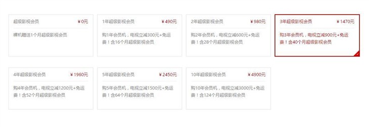 樂視超級電視會員資費490元/年,開通之后手機/平板/PC/電視通用,購機時會附贈一個月的超級影視會員,比較特殊的是隨電視機一同購買會員可以享受多買1年購機費用減少300元的優惠,最終190元/年相對來說還算便宜。