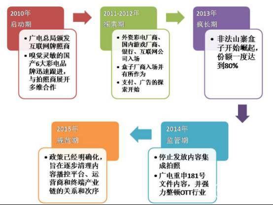 不可否認的是,這是新事物發展的必經階段。從亂象叢生到規范競爭,電視盒子六年經歷了五個階段。