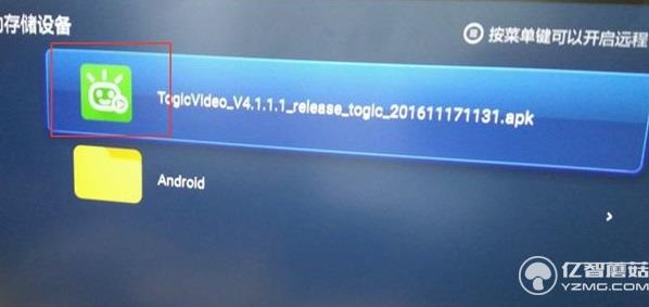 3、打開之后,點擊自己的U盤,并選中安裝文件,按遙控器確認鍵進行安裝: