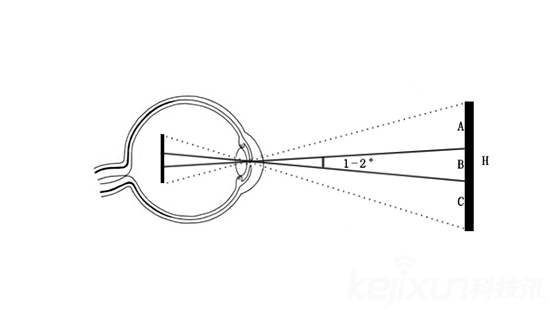 當人眼在看屏幕H時,雖然整個屏幕都可以看到,但是只有B區域額中央凹視野是清晰的, AC區域成像模糊,因此在畫面渲染過程中只需要渲染中央凹視野很小的范圍,對周邊視野區域進行模糊渲染。眼球轉動,高清渲染區域隨著注視點的變化而變化,這樣既可以得到高清的視覺體驗,又可降低GPU負荷,從而可以大幅的降低VR設備對硬件的要求,從而降低成本,或將產品進一步提升。