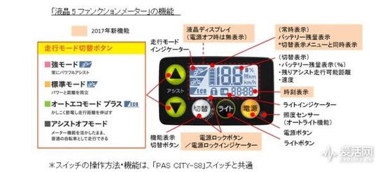 所謂液晶5功能表其實(shí)就是PAS系列電動(dòng)車(chē)的操作面板部分。在這份操作面板上將會(huì)顯示時(shí)間、電池剩余電量、可行駛距離以及行駛模式等。新的機(jī)型也加入了防止誤觸面板的鎖定功能。