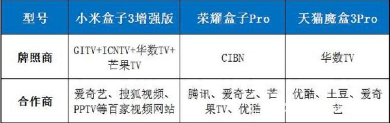 從圖表上看小米盒子3增強版背依4大互聯網牌照商,內容資源更提供百家視頻網站支持,資源內容十分豐富;榮耀盒子Pro搭載CIBN正版影視資源,聚合騰訊、優酷等網站內容;而天貓魔盒3Pro則是依托華數TV,集成優酷大內容平臺。