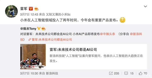 近期,小米科技創始人雷軍在微博上發消息稱:“小米在人工智能領域投入了兩年的時間,今年會有重要的產品發布。”從消息的態度上來說,今年小米一定會在人工智能領域大放異彩,發布非常重要的改變小米未來走向的重要產品。小米現在除了手機,在人工智能方向最大的成績就是電視產品了,可見今年小米電視一定會發布重量級的人工智能電視產品。