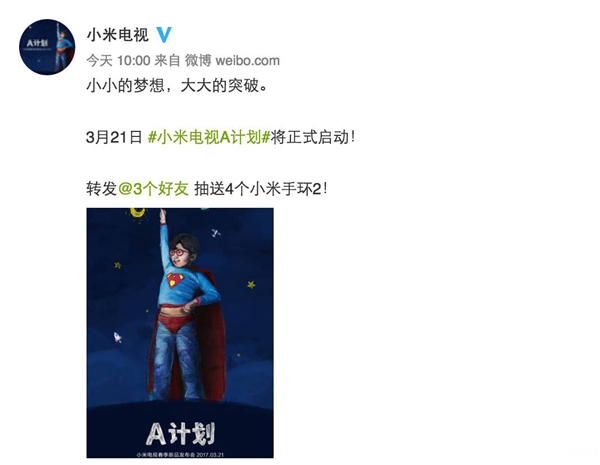 3月16日上午10:00小米電視發布微博稱:3月21日“小米電視A計劃”將正式啟動!結合今年和去年小米電視的動作來說,難道小米電視將發布小米電視4,因為圖片底部可以看到在圖片的底部有“小米電視春季新品發布會”的字樣。但小米電視4更像是去年小米發布的手機概念機MIX,可能離量產還有段時間。所以這次小米可能并不會發布無邊框的小米電視4,更多的可能是繼續在人工智能的路上走下去,而且通過雷軍現在對外的發言態度,此次小米電視發布的新品必然是人工智能電視。