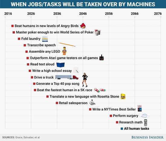至于那些更復雜和更具創造性的任務,例如寫書和進行高等數學運算,則需要更長時間。這項調研稱:到2061年,人工智能將可完成所有人類任務,到2136年。。。將取代所有人類職位!