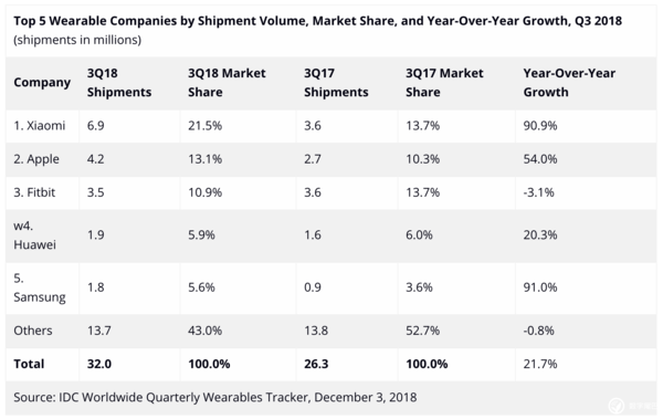 12 月初,IDC 公布 2018 年第三季度全球可穿戴設備(涵蓋智能手表、手環等品類)市場出貨量排行榜。
