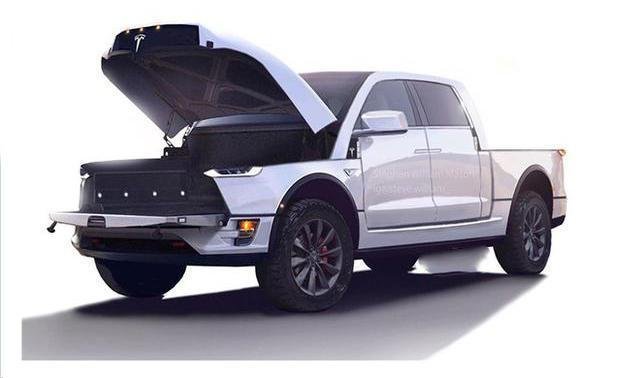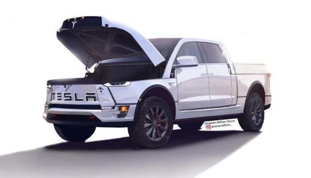 通過上面這張假想圖,我們發現,為了方便消費者拿取物品,特斯拉皮卡發動機艙是可以支持兩段開啟的方式。這樣對于拿取物品更加的方便。不過由于是假想圖,這張設計圖還是暴露了一些問題的地方,那就是前備箱的尺寸有些大了。因為如果是四驅類型的電動皮卡。需要在前軸的地方設置一臺電動機。